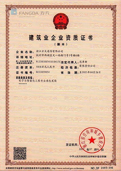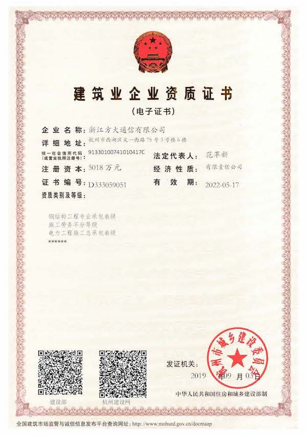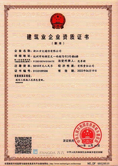 浙江方大通信有限公司成立于2002年,總部坐落于杭州,擁有建設(shè)部通信工程總承包壹級(jí)資質(zhì)、建筑智能化貳級(jí)資質(zhì)、鋼結(jié)構(gòu)工程專業(yè)承包叁級(jí)和國(guó)家電監(jiān)會(huì)承裝(修、試)電力設(shè)施許可證等相關(guān)資質(zhì),是“國(guó)家高新”及“AAA”信用企業(yè),并通過國(guó)際ISO9001質(zhì)量管理體系認(rèn)證?!?/span>