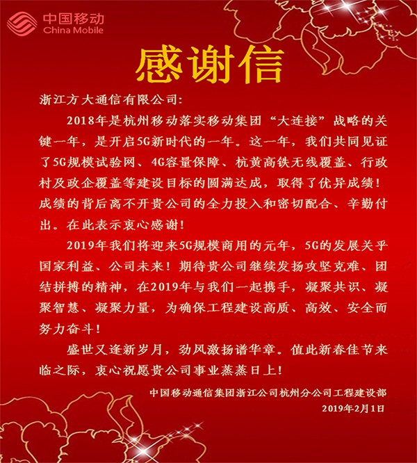來(lái)自中國(guó)移動(dòng)浙江公司杭州分公司的感謝信