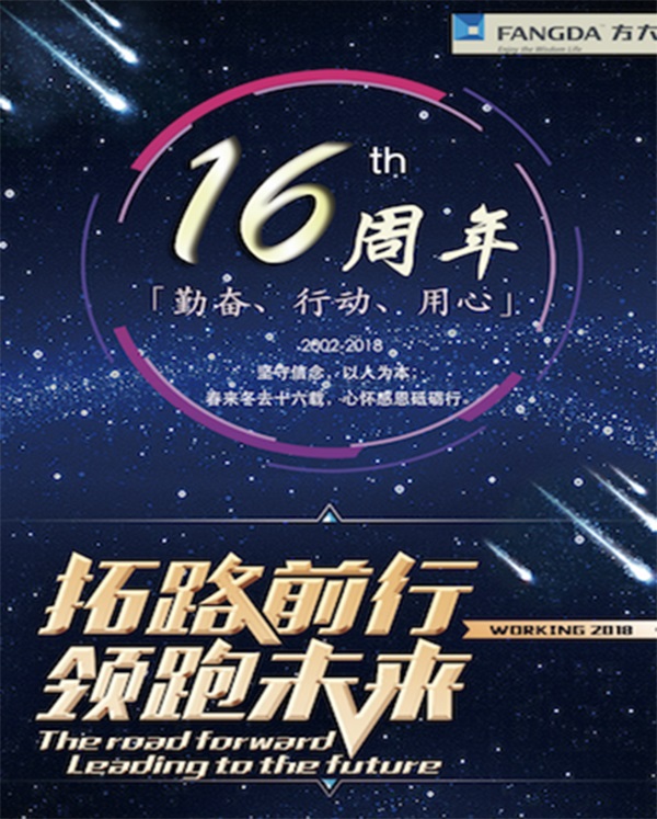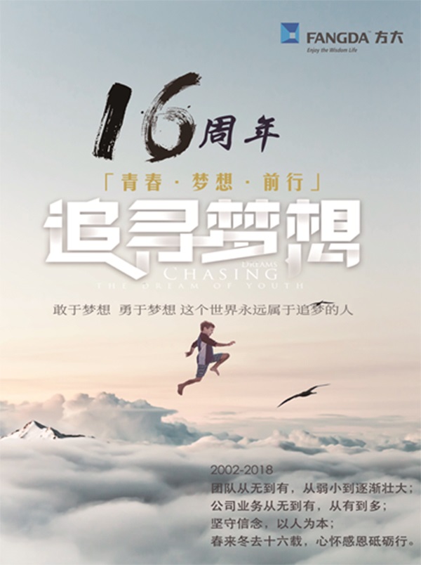 十六年的時光,用簡單的話語、海報是囊括不了所有的點滴,十六年,也就是5844天,也就是經(jīng)歷了四屆奧林匹克運動會、四屆世界杯。想想你的16年發(fā)生了什么,可能剛剛上小學(xué),到現(xiàn)在大學(xué)畢業(yè),可能剛剛結(jié)婚,到現(xiàn)在孩子已經(jīng)上學(xué)……時間帶走了經(jīng)歷,帶來了痕跡。當(dāng)然,方大也在十六年發(fā)生了蛻變。十六年來,增加的是業(yè)務(wù),變多的是員工,不變的是方大精神——